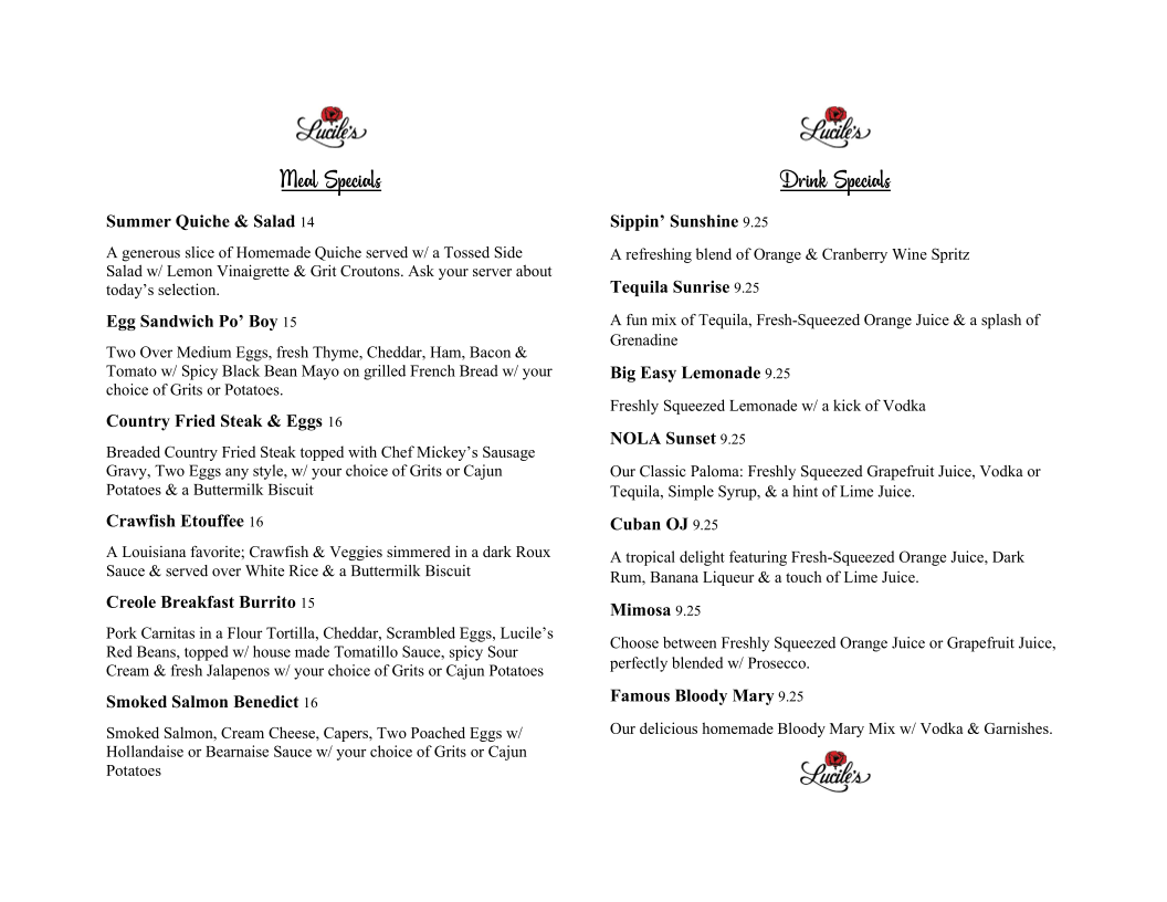 The menu at Lucile’s features a variety of mouthwatering dishes that capture the essence of Creole flavors. Start your culinary adventure with their homemade Beignets—pillowy doughnuts dusted with powdered sugar that are served hot, making them the ultimate indulgence for just $6.95. Pair them with a freshly squeezed Orange or Grapefruit Juice, also made right at your table, for a refreshing start to your meal.